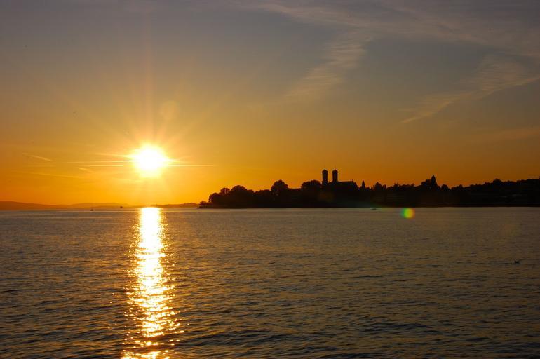 Keywords: lake constance water dusk waters panorama sky sunset mood reflection distant view port sunbeam lens flare