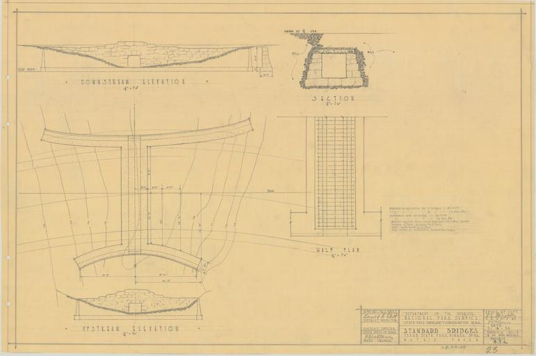 | Keywords: lake corpus christi state park lakecorpuschrististatepark texas state parks texasstateparks ccc civilian conservation corps civilianconservationcorps sketch drawing text document writing Title: Standard Bridges Specific Date: 9/18/1934 Architect: Bones, J. William, draftsman Remarks: Pencil on paper showing Standard bridges, including section, half plan, downstream elevation and upstream elevation. Dimensions: LN: 32.625" x WD: 21.625" Title: Standard Bridges Specific Date: 9/18/1934 Architect: Bones, J. William, draftsman Remarks: Pencil on paper showing Standard bridges, including section, half plan, downstream elevation and upstream elevation. Dimensions: LN: 32.625" x WD: 21.625" |
