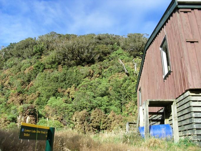 Keywords: Lake Dive Hut 4.jpg The Lake Dive Hut in Egmont NP<br> The blue barrel is a shelter for hunter's dogs 2013-03-13 own Sarang Lake Dive Hut