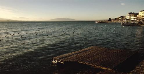 Keywords: lake geneva nyon switzerland lake water lakeside waterfront city jetty morning sunrise scene atmospheric view panorama buildings promenade