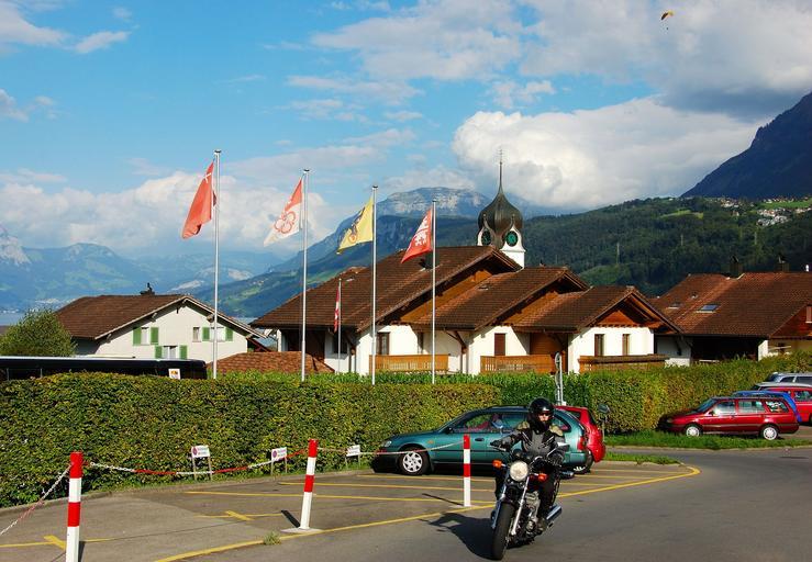 Keywords: lake lucerne region switzerland motorcycle city church