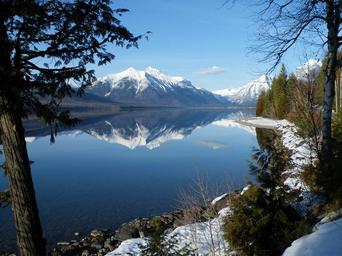 Keywords: lake mcdonald mount vaught landscape scenic mountains skyline peak snow reflection water glacier national park montana usa trees peaceful