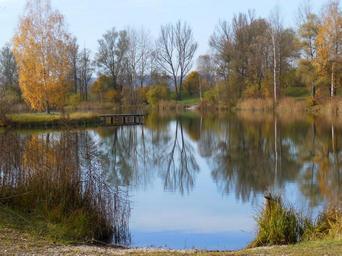 Keywords: lake perach peracher bathing lake altötting badesee water autumn mood mirroring nature landscape trees bushes natural lake separated by comma