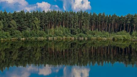 Keywords: lake pond water forest nature lake view desktop background idyll landscape reflections quiet bank spieglung background sky