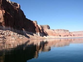 Keywords: lake powell arizona water shoreline lake mountains formations reflections sky clouds beautiful spring summer rocks rocky destinations