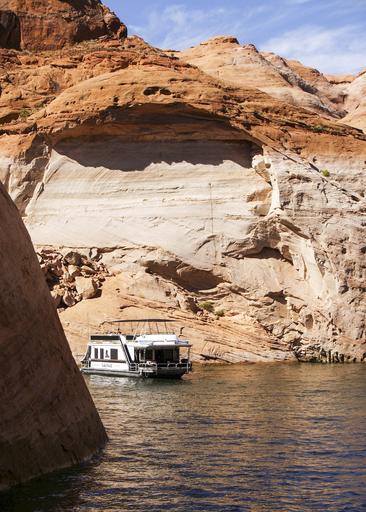 Keywords: lake powell water reservoir arizona usa red rocks hot dry house boat boating tourist attraction vacation outdoor activity landscape nature scenery erosion desert