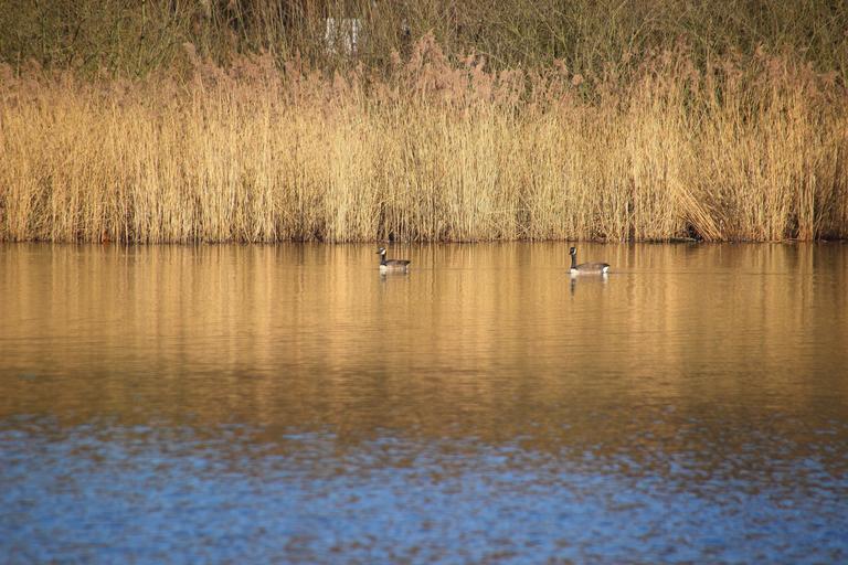Keywords: lake reed birds bank pond nature mirroring idyll lakeside beautiful waters mood water sun geese wild geese