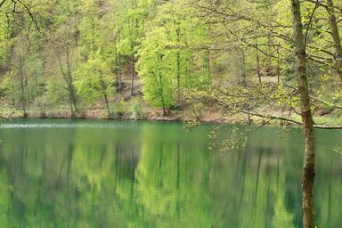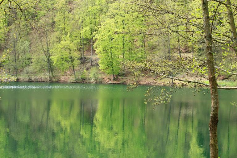 Keywords: lake tree trees mirroring reflections water surface spring landscape nature hike hiking forest path trail forest green leaves deciduous tree bright