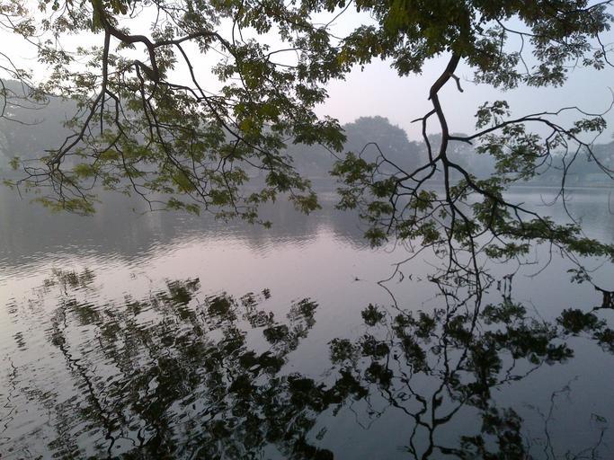 Keywords: lake water scenic nature trees misty weather sky reflection tranquil forest environment