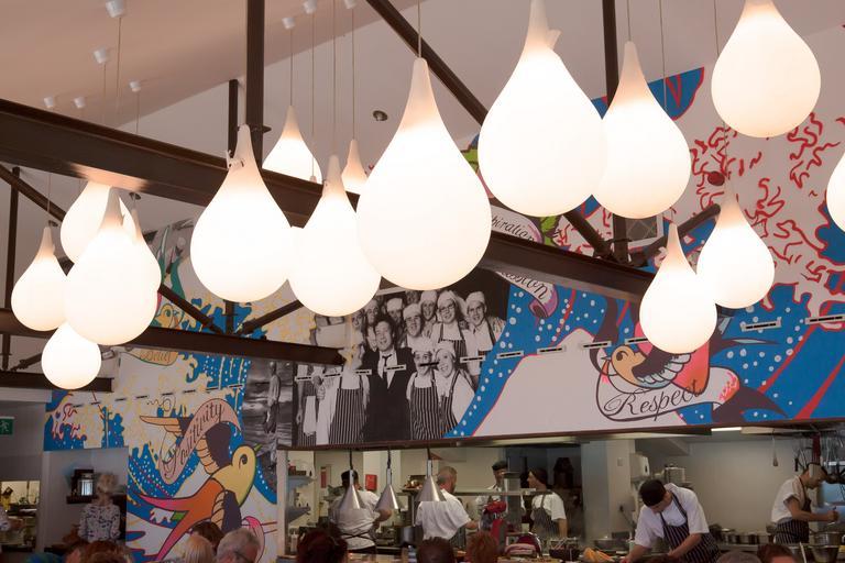 Keywords: lamps interior design restaurant kitchen open demonstration kitchen wall decoration team architecture inn lighting