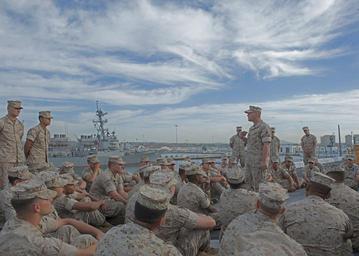 Keywords: Lance Corporals Leadership and Ethics Seminar 150501-N-CC789-139.jpg en SAN DIEGO May 1 2015 U S Marines assigned to 1st Tank Battalion of the Marine Corps Air Ground Combat Center Twentynine Palms listen a deliver message from Maj Peter Schnurr acting commanding officer 1st Tank Battalion aboard amphibious transport dock ship USS Somerset LPD 25 Somerset served as the platform for a-week long Lance Corporals Leadership and Ethics Seminar to ensure a better understanding of Marine Corps ethos leadership fundamentals and the total Marine amphibious concept The ninth San Antonio-class amphibious transport dock ship Somerset is named in honor of the crew and passengers of United Airlines Flight 93 which crashed near Shanksville Pa in Somerset County during the Sept 11 2001 terrorist attacks U S Navy photo by Mass Communication Specialist 1st Class Vladimir Ramos/Released 2015-05-01 Petty Officer 1st Class VLADIMIR RAMOS https //www dvidshub net/image/1912763 150501-N-CC789-139 2015-05-05 00 01 SAN DIEGO CA US PD-USGov-Military-Navy Marine Corps Air Ground Combat Center Twentynine Palms USS Somerset LPD-25 Images from DoD uploaded by Fæ |