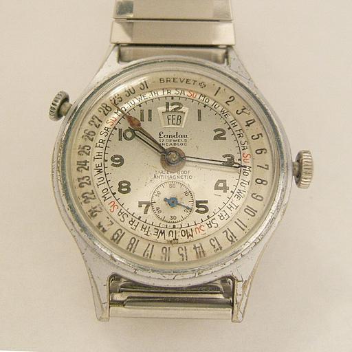 | Keywords: Landau Date Hand Watch.JPG Landau date hand watch Manual 17 jewel movement by Eloga Co probably made in 1950s These early date watches could not automatically adjust for the different number of days in a month The second crown at 10 o'clock rotates the date chapter ring on the outer part of the face On the first of every month the wearer has to adjust this ring until the date hand points to date 1 The watch belongs to me and still works Additional information about it would be appreciated Own Photo taken March 30 2005 Chris Burks Chetvorno Wristwatches |