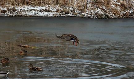 Keywords: Female mallard landing on busy pond. nature wildlife outdoors fowl duck mallard flight landing wings ripples pond