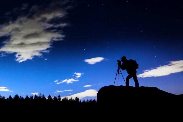 Keywords: landscape camera silhouette photographer night nature photography person black evening sky people blue tripod stars