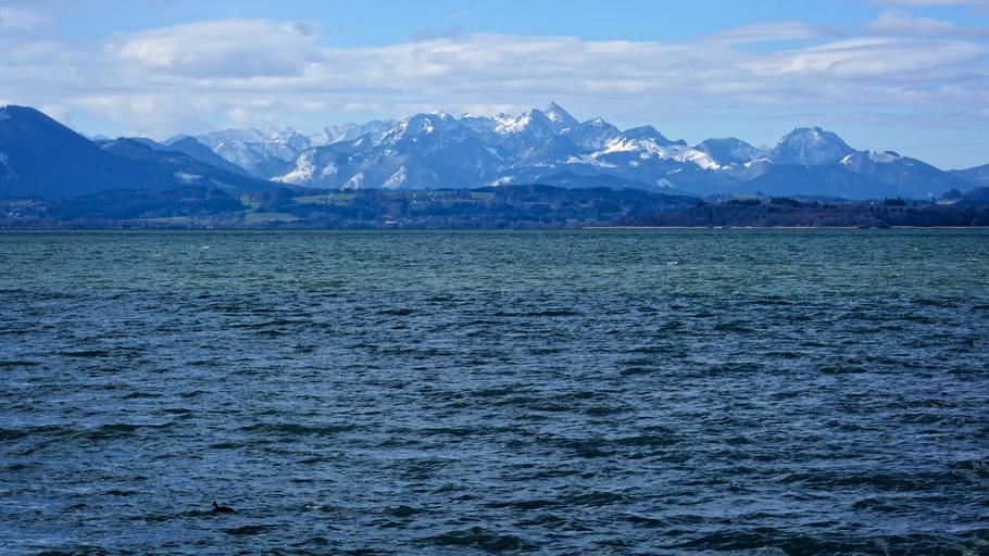 Keywords: landscape chiemsee lake water nature bavaria mountains blue clouds distant vision view distant view winter wide