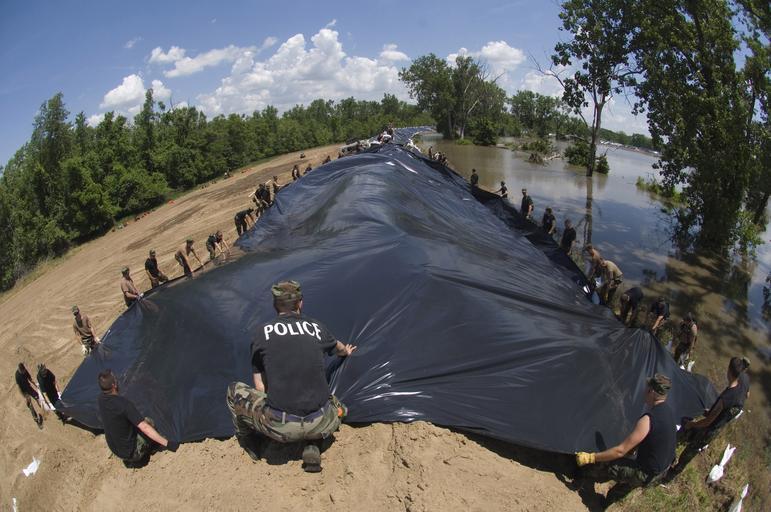 Keywords: landscape forest trees sky clouds summer spring men military tarp spreading nature outside working river water
