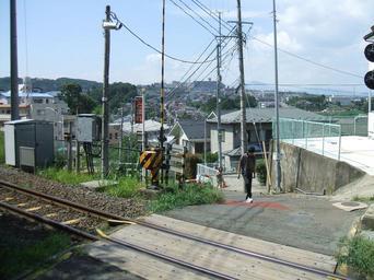 Keywords: Landscape from Kitayama Station of JR Senzan Line.jpg Level crossing on the JR East Senzan Line as seen from Kitayama Station JR 日 仙山線・北山駅から見た踏切 Own Breakover 2010-08-22 Level crossings in Japan Senzan Line Aoba-ku Sendai