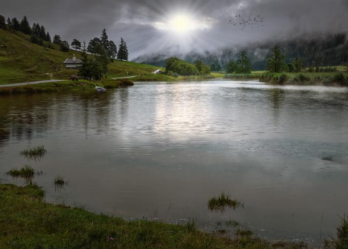 Keywords: landscape lake nature sunbeam boot mirroring