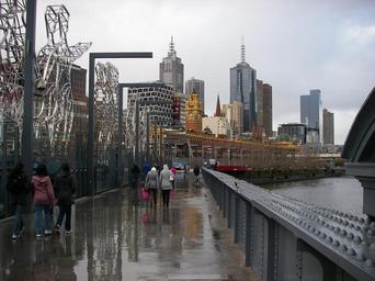 Keywords: Melbourne Sandridge Bridge rainy day Looking diagonally across Yarra River Flinders Street Railway Station