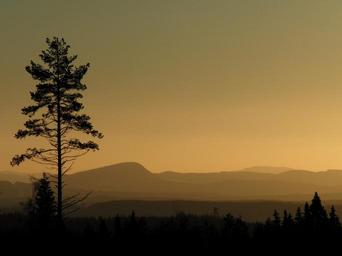 Keywords: landscape mountains trees silhouettes sunset wilderness nature scenic scenery outdoors hazy mist hills panorama horizon dusk evening twilight