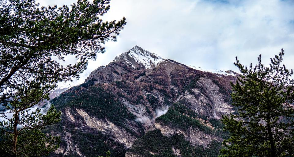 Keywords: landscape nature mountain top peak summit high stone massive steep trees vegetation outdoor snow