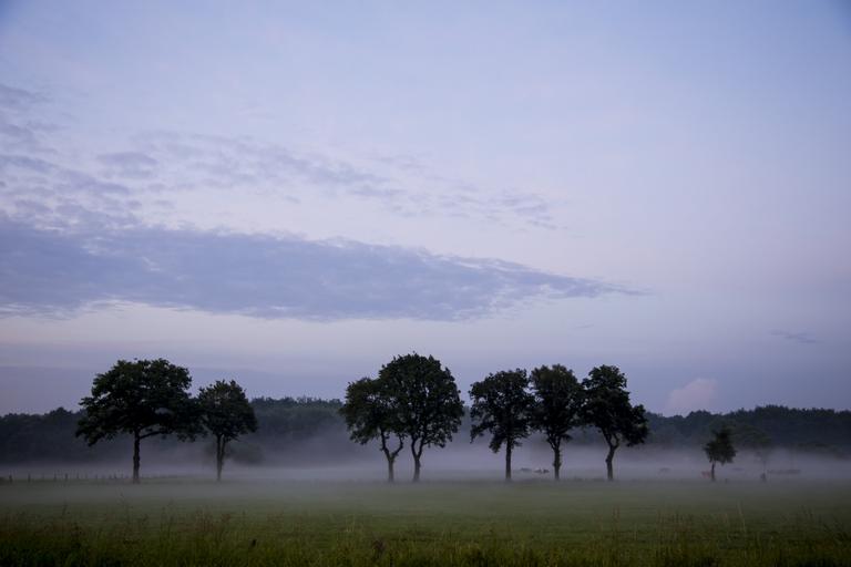Keywords: landscape nature sky rest meadow graze tree trees fog animals