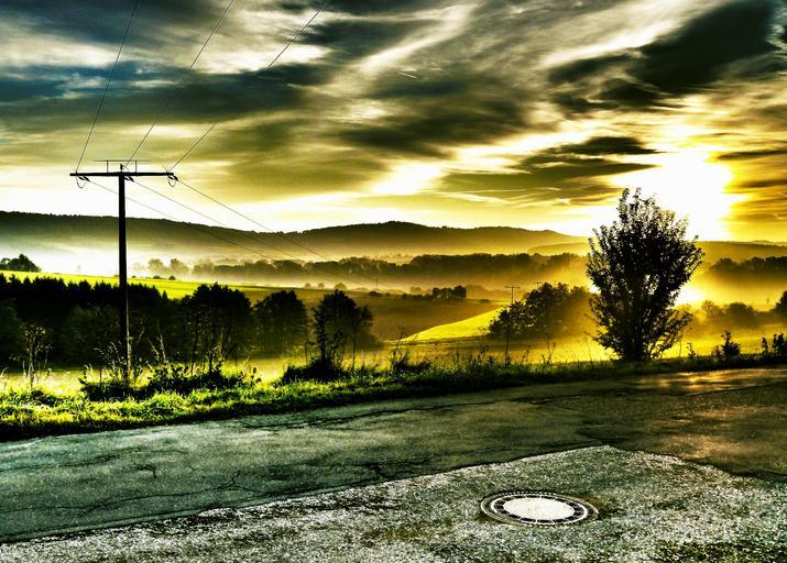 Keywords: landscape power line sunrise autumn fog atmosphere back light hdr