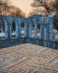 Keywords: landscape ruin mosaic floor arches sunrise sunset peach blue owl