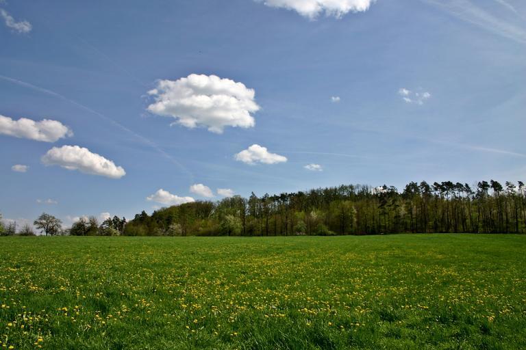 Keywords: landscape spring hill forest edge of the woods nature meadow tree green dandelion flowers bloom sky clouds sunny flora plant wide rest idyll southern germany germany baden württemberg blossom bloom