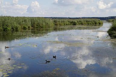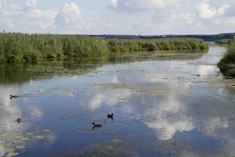 Keywords: landscape spring lake nature reserve nature moorland wetland summer grasses reed silted nature conservation southern germany sky clouds summer landscape baden württemberg mirroring water lake coots tributary waters