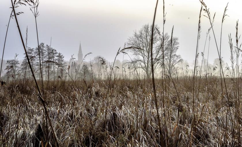 Keywords: landscape steeple twilight fog church atmospheric haze hazy