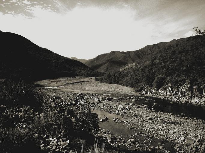 Keywords: landscape stream creek mountains black and white sky clouds forest trees woods water nature outside beautiful countryside