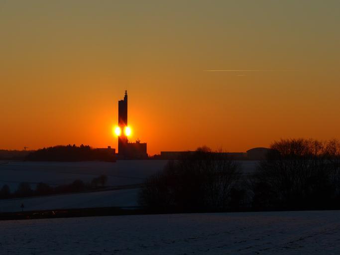 Keywords: landscape wintry winter field arable sunset abendstimmung evening sun tower grain silo schapfe mill flour mill jungingen ulm swabian alb highest grain silo world record record german architecture award architecture building silo memory