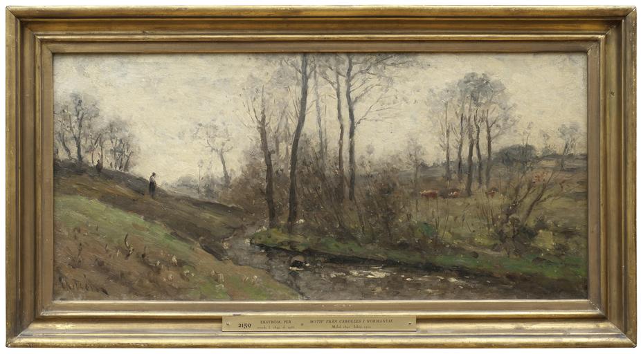 Keywords: Landscape with a Running Brook. Scene from the Carolles in Normandy (Per Ekström) - Nationalmuseum - 19219.tif Artwork Creator Per Ekström Landscape with a Running Brook Scene from the Carolles in Normandy Per Ekström went to France in 1876 and stayed there until 1890 In 1882 “1887 he was living in the village of Carolles on the Nomandy coast where he found the scene for this painting From the 1880s his plein air painting focused on the study of the atmospheric effects of light as in this portrayal of a water meadow on a sunny misty spring day One of his primary influences was the French landscape painter Camille Corot Ekström periodically Per Ekström reste till 1876 till Frankrike där han stannade till 1890 Ã…ren 1882 “1887 vistades han i byn Carolles vid Normandies kust där han hämtade motivet till den här mÃ¥lningen FrÃ¥n 1880-talet var hans friluftsmÃ¥leri inriktat pÃ¥ studiet av ljuseffekter i luften som här i skildringen av en vattensjuk sänka en solig men disig vÃ¥rdag En av hans främsta förebilder var den franske landskapsmÃ¥laren Camille Corot Ekström var i Carolles periodvis utan kontakt med sina svenska konstnärskamrater och levde under svÃ¥ra ekonomiska omständigheter header Per Ekström went to France in 1876 and stayed there until 1890 In 1882 “1887 he was living in the village of Carolles on the Nomandy coast where he found the scene for this painting From the 1880s his plein air painting focused on the study of the atmospheric effects of light as in this portrayal of a water meadow on a sunny misty spring day One of his primary influences was the French landscape painter Camille Corot Ekström periodically Per Ekström reste till 1876 till Frankrike där han stannade till 1890 Ã…ren 1882 “1887 vistades han i byn Carolles vid Normandies kust där han hämtade motivet till den här mÃ¥lningen FrÃ¥n 1880-talet var hans friluftsmÃ¥leri inriktat pÃ¥ studiet av ljuseffekter i luften som här i skildringen av en vattensjuk sänka en solig men disig vÃ¥rdag En av hans främsta förebilder var den franske landskapsmÃ¥laren Camille Corot Ekström var i Carolles periodvis utan kontakt med sina svenska konstnärskamrater och levde under svÃ¥ra ekonomiska omständigheter decade 1880 Oil on canvas Olja pÃ¥ duk Size cm 65 30 5 Framed Size cm 74 40 6 Institution Nationalmuseum Stockholm Signerad Ekström accession number 19219 NM 2159 place of creation Hans Thorwid / Nationalmuseum Nationalmuseum Stockholm cooperation project Licensed-PD-Art PD-old-auto PD-Nationalmuseum_Stockholm 1935 Media contributed by Nationalmuseum Stockholm 2016-10 Paintings in the Nationalmuseum Stockholm Per Ekström |
