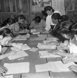| Keywords: Lange Manzanar j8CC-802A.jpg ;Title Manzanar Calif --Part of a class under the Adult Education Program at this War Relocation Authority center It is composed of Issei and Kibei evacuees who are studying the Ideals of American Citizenship and the English language with which they are unfamiliar At this time there are 18 such classes with an attendance of abut 20 to a class and each conducted by a volunteer instructor This is a class in penmanship with Miss Doris Nakagawa 25 as instructor She is an American citizen who finished high school in this country and attended Glendale Junior college upon her return from two years in a Woman's College in Japan -- Photographer Lange Dorothea -- Manzanar California 7/3/42 カリフォルニア州 マンザナ日系人強制収容 における成人向けの授業 アメリカ市民権や英語を知らない 世および帰米疎開 を対象にしたクラス このようなクラスは18あり 平 20人の生徒を ランティアの先生1人が教えていた 写 は25歳のドリス・ナカガワによる英語の書き方の授業 ナカガワはアメリカの高校を卒業後日 の女子短大を終えてグレンデール短大に っていたアメリカ市民である ;Source U S Department of the Interior War Relocation Authority Photographs of Japanese-American Evacuation and Resettlement http //www archives gov National Archives ARC 538095 Record Group 210 This version from The Bancroft Library University of California Berkeley via http //content cdlib org/ark /13030/ft0h4n997z/ brand oac cdlib org PD-USGov Learning People associated with World War II People writing Photographs by Dorothea Lange of Manzanar War Relocation Center |