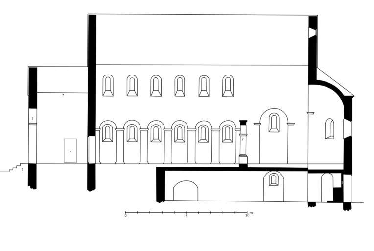 | Keywords: Längsschnitt von Süden Rekonstruktion Müller.svg en drawing of the Einhardsbasilika Steinbach Germany de Zeichnung der de Einhardsbasilika Steinbach <br/> Aus de Bild Längsschnitt von Süden Rekonstruktion Müller jpg Der Längsschnitt geht mit Blick nach Norden Die eingezeichnete Treppe zum Atrium ganz links ist ungesichert daher das Fragezeichen Zu erkennen ist danach von links das Atrium welches 1182 niedergelegt wurde an seine Stelle trat das romanische Westportal zwischen den Türmen Die heutige westliche Mauer erhebt sich dort wo in der Rekonstruktionszeichnung die westliche Mauer des Atriums steht Die ursprüngliche Westseite des Hauptschiffs so wie hier gezeichnet existiert nicht mehr Zu erkennen sind die karolingischen Rundbogenfenster oberhalb des Obergadens Sie existieren bis heute im Originalzustand Weiterhin zu sehen sind die Arkaden des nördlichen Seitenschiffs heute vermauert Im heutigen Zugang des vermauerten nördlichen Nebenchores befindet sich eine spitzbogige gotische Türe Zu erkennen ist außerdem in der Krypta die nördliche Arkonsolnische und rechts unterhalb der Haupapsis der Platz des vermuteten Hauptaltars in der Krypta Die Platte und der Sockel des Altars sind noch vorhanden und befinden sich ebendort Own work based on de Bild Längsschnitt_von_Süden_Rekonstruktion_Müller jpg by de Benutzer Capaci34 based on the dissertation of Dr Otto Müller 1937 MaEr 26 August 2008 MaEr 2008-03-26 Capaci34 49 41 15 N 08 59 48 E Plans of Einhardsbasilika Steinbach Reconstruction drawings of medieval buildings in Germany |