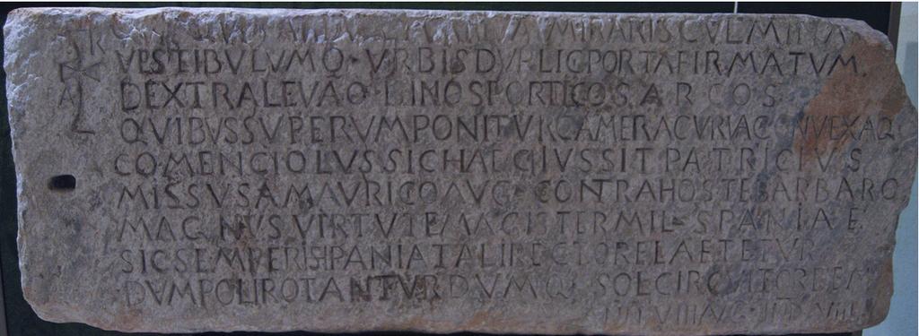 Keywords: Lapida comenciolo.jpg Lápida de Comenciolo Principal testimonio histórico de la presencia bizantina en España s VI Museo Arqueológico de Cartagena QVISQVIS ARDUA TVRRIVM MIRARIS CVLMINA VESTIBVLVMQ VRBIS DVPLICI PORTA FIRMATVM DEXTRA LEVAQ BINOS PORTICOS ARCOS QVIBUS SVPERVM PONITVR CAMERA CURVA CONVEXAQ COMENCIOLVS SIC HAEC IVSSIT PATRICIVS MISSVS A MAVRICIO AVG CONTRA HOSTES BARBAROS MAGNVS VIRTUTE MAGISTER MIL SPANIAE SIC SEMPER HISPANIA TALI RECTORE LAETETVR DVM POLI ROTANTVR DVMO SOL CIRCVIT ORBEM ANN VII AVG IND VIII Quienquiera que seas admirarás las partes altas de la torre y el vestíbulo de la ciudad afirmados sobre una doble puerta a la derecha y a la izquierda lleva dos pórticos con doble arco a los que se superpone una cámara curvo convexa El patricio Comenciolo mandó hacer ésto enviado por Mauricio Augusto contra el enemigo bárbaro Grande por su virtud maestro de la milicia hispánica así siempre Hispania se alegrará por tal rector mientras los polos giren y mientras el sol circunde el orbe Año VIII de Augusto Indicción VIII <br/><br/> The Inscription of Comenciolus Lápida de Comenciolo the principal historical artifact testifying to the presence of the Byzantines in Spain 6th century Archaeological Museum of Cartagena Museo Arqueológico de Cartagena It reads <br/> Whoever you may be you will admire the high sections of the tower and the vestibule of the city constructed over a double entrance To the right and left are attached two porches with double arcs to which a convex curved room is superposed The patrician Comenciolus commissioned its construction dispatched by the Emperor Mauricius against the barbarian enemy Great for his virtue master of the soldiers of Spain thus always Hispania will be indebted for such a director while the poles turn and while the sun surrounds the orb In the VIII year of the Emperor Indiction VIII CIL 02 03420 CartNova 00208 ILCV 00792 CLE 00299 D 00835 IHC 00176 HEp-07 00444 AE 1998 +00694 de Epigraphische Datenbank Heidelberg http //edh-www adw uni-heidelberg de/edh/inschrift/HD037899 HD037899 es Hispania Epigraphica http //eda-bea es/pub/record_card_2 php refpage 2Fpub 2Fsearch_select php quicksearch AE+1998 2C+694 rec 9171 9171 own 2007-08 Nanosanchez 6th-century inscriptions 6th-century works in Spain CIL II 003420 Inscriptions in Cartagena Spain Linked to EDH Linked to HEp Medieval art in Cartagena Spain Museo Arqueológico de Cartagena