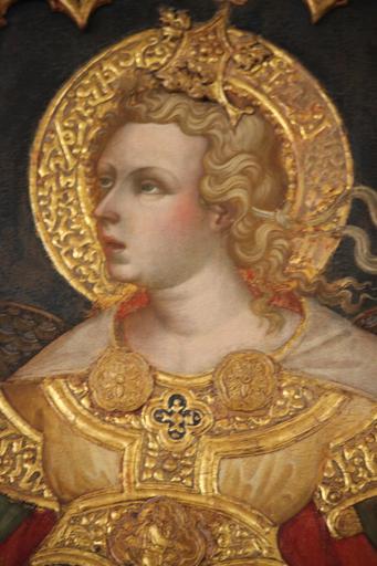 | Keywords: L'arcangelo Michele di Jacobello del Fiore (Trittico della Giustizia), (2).JPG Artwork Q27077942 Creator Jacobello Del Fiore title Justice between the Archangels Michael and Gabriel La Giustizia in trono tra gli arcangeli Michele e Gabriele <br> alternate title it Gallerie dell'Accademia - MIBAC 0270422853-MIBAC 2014 en Justice seated between two lions and the archangels Michael and Gabriel She holds her attributes sword and scales it simbolo della Divina Sapienza tra due leoni che rimandono al trono di Salomone La Giustizia regge con la destrala spada e porta con la sinistra la bilancia San Michele sorregge la bilancia e trasfigghe il drago L'angelo guerriero e difensore della chiesa - nella sua duplice funzione di pesatore di anime e di combattente contra il drago simbolo di Satana 1421 Tempera on panel size cm 208 490 LangSwitch Mittelteil central panel centre/panneau central middenpaneel cm 208 194 ; Saint Michel cm 208 133 ; Saint Gabriel cm 208 163 Institution Gallerie dell'Accademia Venice 01 01 http //www gallerieaccademia it/sale/sala-i Gallerie dell'Accademia<br>Richard Hunter S P Oakley Latin Literature and its Transmission https //books google de/books id A6fZCgAAQBAJ pg PA178 lpg PA178 dq Jacobello+del+fiore+Justice+between+the+Archangels+Michael+and+Gabriel source bl ots WGbh7hEoFM sig tvNmvN_O702pDIBvEUkwy3SFFAM hl de sa X ved 0ahUKEwiczeqc2azOAhVIthQKHd6QBf0Q6AEIZjAN v onepage q Jacobello 20del 20fiore 20Justice 20between 20the 20Archangels 20Michael 20and 20Gabriel f false books google object history it eseguito per la sede del Magistrato del Proprio in Palazzo Ducale credit line en above the head of the left lion Artist's name and date Fiore pinxit 1421 1000 years after the legendary founding of Venice <br> it Le parole dietro la Giustizia Eseguirò gli ammonimenti degli angeli e le parole sacre blanda con i pii nemica dei malvagu e superba con gli orgogliosi sono generalmente attribuite a CristoGiudice nell'arte nordica É evidente l'identificazione della Giustizia con Venezia rappresentata anche nel rilievo sula faciata ouest di Palazzo Ducale L'importante commissione mostra 'influenza di Gentile da Fabriano La cornice presenta sull'estrema destra lo stemma di Tommaso Mocenigo doge 1414-1423 Gabriel Virginei partus humanae nuncia pacis<br>Vox mea virgo ducem rebus te poscit opacis<br> my voice which announces the virgin's birth demands you virgin as leader for your gloomy affairs <br> en The inscriptions are political and religious as the 25th of March is the date of Annunciation and of the legendary founding of Venice accession number cat 15 own Mongolo1984 2014-09-10 it PD-old-100-1923 cc-by-sa-3 0 DEFAULTSORT Jacobello Del Fiore; Triptych 12; Gallerie dell'Accademia Venice Jacobello Del Fiore - Justice between the Archangels Michael and Gabriel - Accademia Venice D12 Paintings of Saint Gabriel in Italy Paintings with Latin inscriptions 15th-century paintings of Saint Gabriel Images from Wiki Loves Monuments 2014 in Italy Uploaded via Campaign wlm-it Images from Wiki Loves Monuments 2014 Images from Wiki Loves Monuments 2014 in Italy needing check |