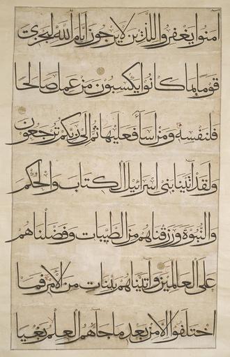 | Keywords: Large Koran.jpg Timurid dynasty circa 1400<br /> Opaque watercolor ink and gold on paper Muḥaqqaq script<br /> 170 x 109cm 66 15/16 x 42 15/16in <br /> Historical Region Uzbekistan This first and the last verses are incomplete The translation of all the verses in their complete form according to Muhsin Khan would be Say O Muhammad to those who have believed that they should forgive those who expect not the days of Allah so that He may recompense a people for what they used to earn Whoever does a good deed - it is for himself; and whoever does evil - it is against the self Then to your Lord you will be returned And We did certainly give the Children of Israel the Scripture and judgement and prophethood and We provided them with good things and preferred them over the worlds And We gave them clear proofs of the matter of religion And they did not differ except after knowledge had come to them - out of jealous animosity between themselves Indeed your Lord will judge between them on the Day of Resurrection concerning that over which they used to differ 45 14-17 the English language Wikipedia http //en wikipedia org/w/index php title Special Log page File Large_Koran jpg log uploaded by en User Kodemage February 18 2006 original upload date Assessments 1 PD-Art Qur'an manuscripts 14th-15th century Timurid dynasty |