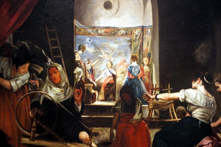 | Keywords: Las hilanderas copia (Ulpiano Checa).JPG Artwork Creator Ulpiano Checa Las hilanderas Oil on canvas cm 62 5 80 5 Museo Ulpiano Checa Colmenar de Oreja Comunidad de Madrid España Firmado ángulo inferior izquierdo Copia de Ulpiano Checa En el reverso con grafito Copia Los alumnos de la Escuela de Bellas Artes de San Fernando estaban obligados a realizar copias de las obras de artistas consagrados Esta obra de juventud de Checa perteneció a Don Pedro Pérez Lemaur Diputado a Cortes en Madrid que debió conocer a Don Luis Ballester protector de Ulpiano Checa La oscuridad de este lienzo no debe imputarse al joven pintor puesto que cuando realizó la copia la obra original de Velázquez nunca había sido limpiada por lo que Checa se limitó a plasmar las condiciones en que se encontraba Poniol PD-old-75 Other versions cc-by-sa-3 0 Uploaded with UploadWizard Ulpiano Checa Pintura espa |