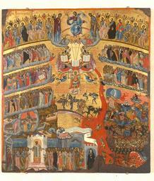 | Keywords: Last Judgment by F.Kavertzas (1640-41).jpg  Η Δευτέρα Παρουσία 1640-1641 124 5x38εκ Φραγκιάς Καβερτζάς ΧΕΙΡ ΦΡΑΓΓΙΑ ΚΑΒΕΡΤΖΑ ΔΕΗCΙC ΤΗC ΔΟΥΛΗC ΤΟΥ ΘΕΟΥ ΕΥΓΕ ΗΑC  Ο ΑΧΗC ΤΗC ΤΡΑΠΕΖΟ ΤΙΟΠΟΥΛΑC Στην εικόνα  αριστάνεται ο Χριστός ως Κριτής στο μέσον και ε άνω χαμηλότερα ο σταυρός και οι άγγελοι  ου κρατούν βιβλία ή σαλ ίζουν και ο αρχάγγελος  ιχαήλ με τη ζυγαριά των ψυχών και το σ αθί Πιο κάτω  αριστάνεται ο  ροφήτης Δανιήλ ξα λωμένος σε ένα σύννεφο και δί λα του ειλητό με κείμενο της Παλαιάς Διαθήκης  ου αναφέρεται στο όραμά του για την έλευση του Υιού του Ανθρώ ου Στην αριστερή  λευρά εικονίζονται οι δίκαιοι σε τρεις διαδοχικές σειρές και στη δεξιά τα έθνη  ου  εριμένουν να κριθούν Πιο κάτω δεξιά  αριστάνεται η Κόλαση με τις α εικονίσεις της γης της θάλασσας του ουρανού τον βασανισμό των αμαρτωλών και το βύθιο δράκοντα ενώ αριστερά βρίσκεται ο Παράδεισος με τον Χριστό ως  έγα αρχιερέα να υ οδέχεται τους δικαίους στην Πύλη του Παραδείσου Σε μία άλλη  ύλη βρίσκεται η Παναγία και σε μία τρίτη η αφιερώτρια http //eib xanthi ilsp gr/gr/icons asp 1640 1641 Fragias Kavertzas PD-old Files uploaded by Shakko from various sources Icons of Last Judgment Cretan School 15th-century icons of Byzantine Empire 17th-century icons of Greece |