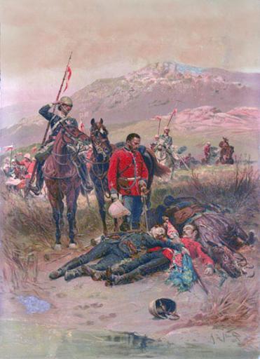 | Keywords: Last Sleep of the Brave.jpg en Prev - 1 of 1 results - Next » 'Last Sleep of the Brave' Isandlwana Zulu War 1879 Oleograph after Alphonse de Neuville 1881 This work depicts a patrol from the 17th Duke of Cambridge's Own Lancers discovering the bodies of Lieutenant Teignmouth Melvill and Lieutenant Nevill Josiah Aylmer Coghill 24th 2nd Warwickshire Regiment of Foot who were both killed attempting to save the Queen's Colour of the 1st Battalion at the Battle of Isandlwana on 22 January 1879 The depiction of the 17th Lancers is however anachronistic as when the bodies were retrieved the lancers had yet to leave England for South Africa NAM Accession Number NAM 1956-02-284-1 Copyright/Ownership National Army Museum London Location National Army Museum Study Collection Browse related themes Last Stands and Forlorn Hopes Death or Glory 17th/21st Lancers 1879 http //www nam ac uk/online-collection/detail php acc 1956-02-284-1 Alphonse de Neuville PD-Art Uploaded with UploadWizard British Lancers Regiments Anglo-Zulu War |