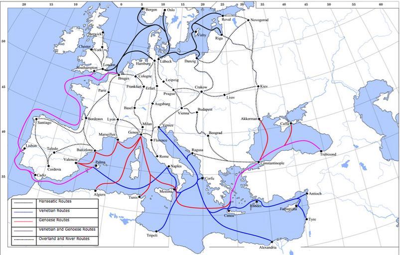 | Keywords: Late Medieval Trade Routes.jpg  Map showing the main trade routes of late medieval Europe The black lines show the routes of the Hanseatic League the blue Venetian and the red Genoese routes Purple lines are routes used by both the Venetians and the Genoese Overland and river routes are stippled Own 2008-03-28 Lampman The map is based on this 200px which in turn is based on an old PD map Maps showing history of the Late Middle Ages Maps of the Mediterranean Sea Maps of the North Sea Maps of the Baltic Sea Maps of maritime history Trade routes |