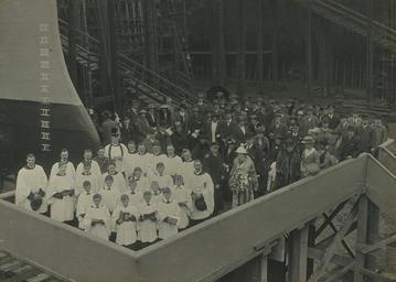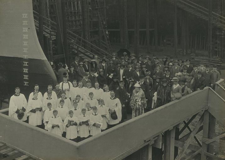 | Keywords: ww1 hawthorn leslie hawthornleslie shipbuilding hebburn hms champion hmschampion ship launch shiplaunch battle of jutland battleofjutland first world war firstworldwar royal navy royalnavy maritime heritage maritimeheritage unusual industry platform timber rail ramp choir song paper book uniform church boys men gathering women structure vessel ship steel planks roman numeral romannumeral number debris hats shirt tie moustache coat blouse dress flowers trousers suit blazer jacket ribbon button naval crew workers frock holding hands holdinghands striking launch party launchparty lady cynthia asquith ladycynthiaasquith hebburn shipyard hebburnshipyard 29 may 1915 29may1915 uninvited guests uninvitedguests discreet guest c-class light cruiser cclasslightcruiser light cruiser squadron lightcruisersquadron warship construction event occasion Launch party of HMS Champion, launched by Lady Cynthia Asquith at the Hebburn shipyard of Hawthorn Leslie, 29 May 1915 (TWAM ref. 4923/2). Have you noticed a few uninvited guests in the background. sneaking into the photo? HMS Champion was a C-class light cruiser and one of the first vessels of the Light Cruiser Squadron in action at the Battle of Jutland. The Rivers Tyne and Wear were responsible for building many vessels, which served Britain during the First World War. This set remembers some of those warships that took part in the Battle of Jutland from 31 May to 1 June 1916. During the battle over 6,000 British sailors lost their lives and 14 Royal Naval vessels were sunk. The losses included the battlecruisers HMS Queen Mary and HMS Invincible, as well as the destroyers HMS Shark, HMS Sparrowhawk and HMS Turbulent, all built on Tyneside. Their memory lives on. (Copyright) We're happy for you to share these digital images within the spirit of The Commons. Please cite 'Tyne & Wear Archives & Museums' when reusing. Certain restrictions on high quality reproductions and commercial use of the original physical version apply though; if you're unsure please email archives@twmuseums.org.uk Launch party of HMS Champion, launched by Lady Cynthia Asquith at the Hebburn shipyard of Hawthorn Leslie, 29 May 1915 (TWAM ref. 4923/2). Have you noticed a few uninvited guests in the background. sneaking into the photo? HMS Champion was a C-class light cruiser and one of the first vessels of the Light Cruiser Squadron in action at the Battle of Jutland. The Rivers Tyne and Wear were responsible for building many vessels, which served Britain during the First World War. This set remembers some of those warships that took part in the Battle of Jutland from 31 May to 1 June 1916. During the battle over 6,000 British sailors lost their lives and 14 Royal Naval vessels were sunk. The losses included the battlecruisers HMS Queen Mary and HMS Invincible, as well as the destroyers HMS Shark, HMS Sparrowhawk and HMS Turbulent, all built on Tyneside. Their memory lives on. (Copyright) We're happy for you to share these digital images within the spirit of The Commons. Please cite 'Tyne & Wear Archives & Museums' when reusing. Certain restrictions on high quality reproductions and commercial use of the original physical version apply though; if you're unsure please email archives@twmuseums.org.uk |