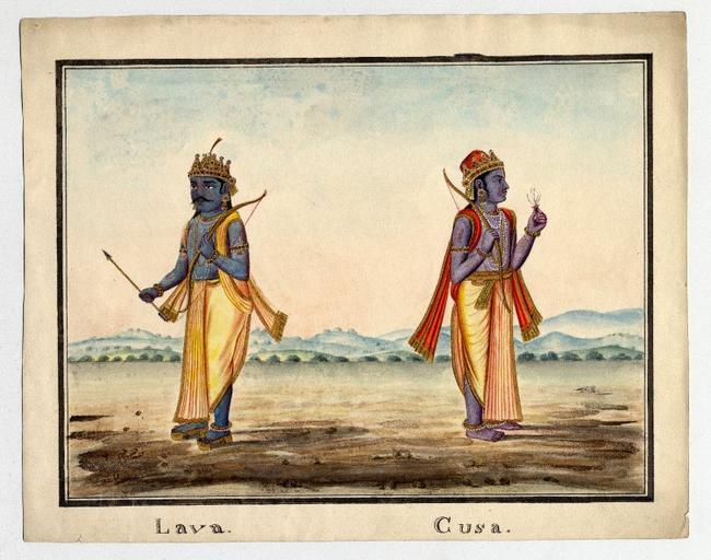 Keywords: Lava and Kusa, the sons of Rāma..jpg en Watercolour painting on paper of Lava and Kusa the sons of Rāma Both figures are shown standing and have two arms and blue skin They wears yellow dhoti s and are crowned Lava on the left is shown holding a bow and arrow with a yellow shawl draped over his shoulders Kusa on the right is shown holding a bow and a flower with a red shawl over his shoulders Both men wear necklaces armlets and have sectarian marks drawn on their arms and chests Lava is shown wearing wooden sandals on his feet whilst Kusa is barefoot In the distance behind the pair are shown hills and trees The painting is surrounded by a black border 19thC early http //www britishmuseum org/research/search_the_collection_database/search_object_details aspx objectid 182836 partid 1 searchText ramayana fromADBC ad toADBC ad numpages 10 images on orig 2fresearch 2fsearch_the_collection_database aspx currentPage 15 Company School PD-Art Uploaded with UploadWizard Lava Kusha