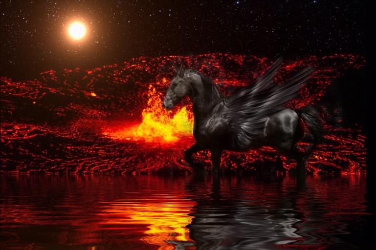 Keywords: lava sun flame lake water black fire pegasus burn wing horse fly mystical fairytale embers mood atmosphere atmospheric light fairy tales fantastic magic fantasy landscape nature
