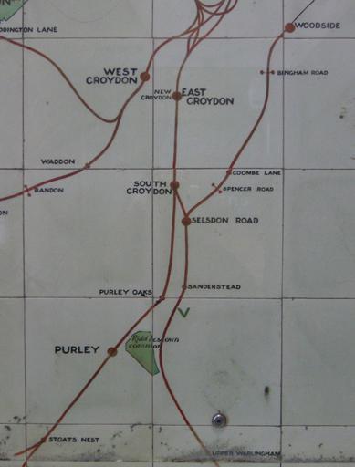 Keywords: LB and SCRly map 204.jpg 300px right Part of a map of the suburban lines of the London Brighton and South Coast Railway made in ceramic tiles and on display at Victoria Station It dates from after 1905 because Bandon Halt station opened in 1906 and from before 1911 because it shows http //www subbrit org uk/sb-sites/stations/c/coulsdon_north/index shtml Stoats Nest station which was renamed in that year At the centre of the image on the right is a station entrance Go in there and look to your left You will see a ceramic map of the whole of the LB SCR network A few steps further on and also on the left is this map Some of you have walked past it many times and never seen it The http //rhaworth ucoz net/tq/th/072203 jpg map key describes Bingham Road Spencer Road and Bandon as motor halts The green 'V' below Sanderstead marks a golf club presumably Purley Downs GC The silver object near the bottom is the head of a screw which is holding a protective perspex sheet in place PD-Art but for the ruling cited above I would licence this as my own work with Roger W Haworth's licence Signs in London Victoria station Rail transport maps of the United Kingdom Maps of the London Borough of Croydon Rail transport in the London Borough of Croydon Ceramics in the City of Westminster Artworks missing infobox template |