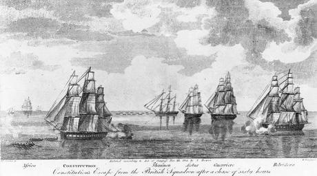 Keywords: blackandwhite monochrome outdoor black and white LC-USZ62-121: USS Constitution escaping from the British Squadron after a chase of sixty hours. Engraving by William Hoogland; Artist Michele F. Corne; publisher Abel Bowen, November 25, 1815. Prints shows rowboats towing USS Constitution away from the British fleet as the British frigate Belvidera fires its cannons. In the background, rowboats tow the British frigate Shannon. Other ships in the squadron are HMS Africa, HMS Aeolus, HMS Guerriere. (7/2/2015) On July 19, 1812, the frigate Constitution, under the command of Captain Issac Hull, escaped from the British squadron under the command of Captain Philip Vere Broke after a three day chase off New Jersey. Constitution’s crew utilized a combination of good luck, good seamanship, and hard work. In the near-dead calm, Hull warped ship with boats and anchor and wet sails to catch every breeze. Though the British copied his moves, he managed to outdistance them. LC-USZ62-121: USS Constitution escaping from the British Squadron after a chase of sixty hours. Engraving by William Hoogland; Artist Michele F. Corne; publisher Abel Bowen, November 25, 1815. Prints shows rowboats towing USS Constitution away from the British fleet as the British frigate Belvidera fires its cannons. In the background, rowboats tow the British frigate Shannon. Other ships in the squadron are HMS Africa, HMS Aeolus, HMS Guerriere. (7/2/2015) On July 19, 1812, the frigate Constitution, under the command of Captain Issac Hull, escaped from the British squadron under the command of Captain Philip Vere Broke after a three day chase off New Jersey. Constitution’s crew utilized a combination of good luck, good seamanship, and hard work. In the near-dead calm, Hull warped ship with boats and anchor and wet sails to catch every breeze. Though the British copied his moves, he managed to outdistance them. |