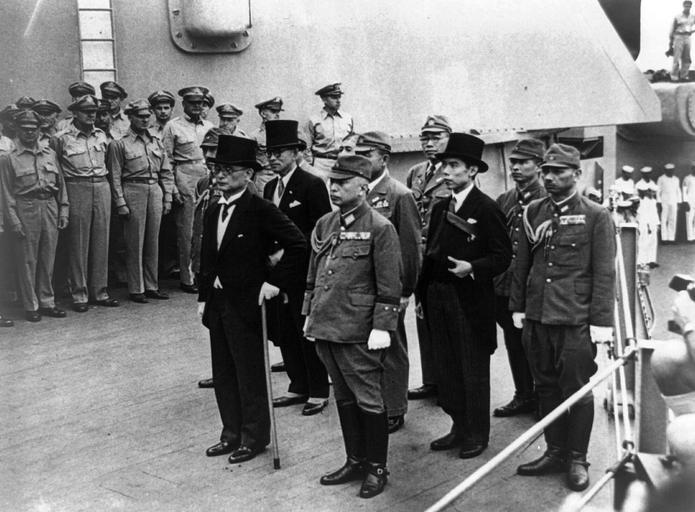| Keywords: blackandwhite monochrome black and white LC-USZ62-93532 (USA C-2719): Black and white only – original is in color. Surrender of Japan, Tokyo Bay, 2 September 1945. Japanese representatives on board USS Missouri (BB-63) during the surrender ceremonies, 2 September 1945. Standing in front are: Foreign Minister Mamoru Shigemitsu (wearing top hat) and General Yoshijiro Umezu, Chief of the Army General Staff. Behind them are three representatives each of the Foreign Ministry, the Army and the Navy. They include, in middle row, left to right: Major General Yatsuji Nagai, Army; Katsuo Okazaki, Foreign Ministry; Rear Admiral Tadatoshi Tomioka, Navy; Toshikazu Kase, Foreign Ministry, and Lieutenant General Suichi Miyakazi, Army. In the the back row, left to right (not all are visible): Rear Admiral Ichiro Yokoyama, Navy; Saburo Ota, Foreign Ministry; Captain Katsuo Shiba, Navy, and Colonel Kaziyi Sugita, Army. (Identities those in second and third rows are from an annotated photograph in Naval History and Heritage Command files.) Photograph from the Army Signal Corps. (2015/11/13). LC-USZ62-93532 (USA C-2719): Black and white only – original is in color. Surrender of Japan, Tokyo Bay, 2 September 1945. Japanese representatives on board USS Missouri (BB-63) during the surrender ceremonies, 2 September 1945. Standing in front are: Foreign Minister Mamoru Shigemitsu (wearing top hat) and General Yoshijiro Umezu, Chief of the Army General Staff. Behind them are three representatives each of the Foreign Ministry, the Army and the Navy. They include, in middle row, left to right: Major General Yatsuji Nagai, Army; Katsuo Okazaki, Foreign Ministry; Rear Admiral Tadatoshi Tomioka, Navy; Toshikazu Kase, Foreign Ministry, and Lieutenant General Suichi Miyakazi, Army. In the the back row, left to right (not all are visible): Rear Admiral Ichiro Yokoyama, Navy; Saburo Ota, Foreign Ministry; Captain Katsuo Shiba, Navy, and Colonel Kaziyi Sugita, Army. (Identities those in second and third rows are from an annotated photograph in Naval History and Heritage Command files.) Photograph from the Army Signal Corps. (2015/11/13). |
