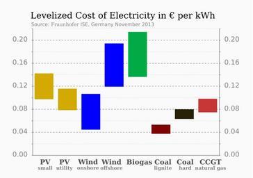 Keywords: LCOE comparison fraunhofer november2013.svg kilowatt-hour Comparison between different renewable technologies and conventional power plants in Germany 2013 Calculation basis assumes a given annual global horizontal irradiation GHI in kilowatt-hours per square meter for photovoltaics and a certain number of annual full load hours FLH for wind turbine s biogas and Fossil-fuel power station conventional power plant s Investment related factors are also taken into account <br> d4aa00 1px solid A38300 PV system ”small scale annual GHI of 1000 to 1200 kWh/m² <br> d4aa00 1px solid d4aa00 PV system ”utility scale annual GHI of 1000 to 1200 kWh/m² <br> 0000ff 1px solid 0000CC Wind power ”onshore annual FLH of 1300 to 2700 hours <br> 0000ff 1px solid 0000ff Wind power ”offshore annual FLH of 2800 to 4000 hours <br> 00aa44 1px solid 00752F Biogas annual FLH of 6000 to 8000 hours <br> 800000 1px solid 4D0000 Coal ”lignite annual FLH of 6600 to 7600 hours <br> 28220b 1px solid 000000 Coal ”hard annual FLH of 5500 to 6500 hours <br> c83737 1px solid A02C2C CCGT w Combined cycle ”natural gas annual FLH of 3000 to 4000 hours 2014-07-19 inkscape margin 5px 0; Valid SVG none own based on http //www ise fraunhofer de/en/publications/veroeffentlichungen-pdf-dateien-en/studien-und-konzeptpapiere/study-levelized-cost-of-electricity-renewable-energies pdf Levelized Cost of Electricity ”Renewable Energy Technologies a study by the http //www ise fraunhofer de/en Fraunhofer ISE Germany November 2013 edition p 4 http //www webcitation org/6RYpyglEn archived PDF Rfassbind thumb left Stromgestehungskosten German Renewable energy schemas and diagrams Energy costs |
